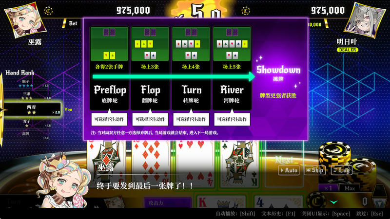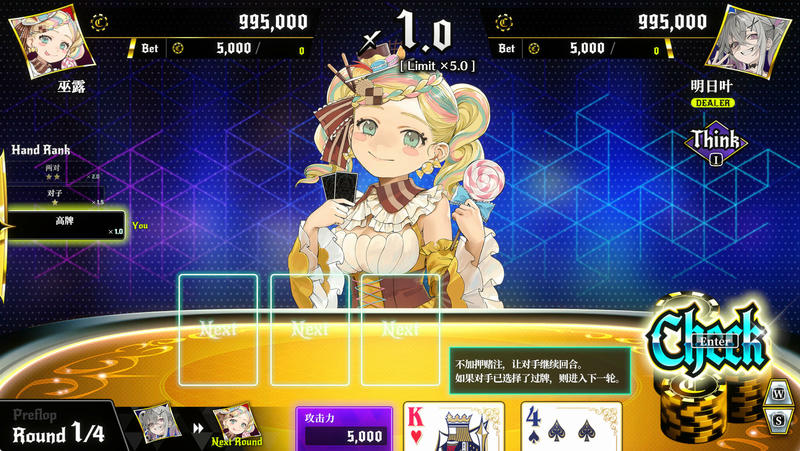 本作的扑克对决是类似于德州扑克的,1对1混战类扑克卡牌游戏。